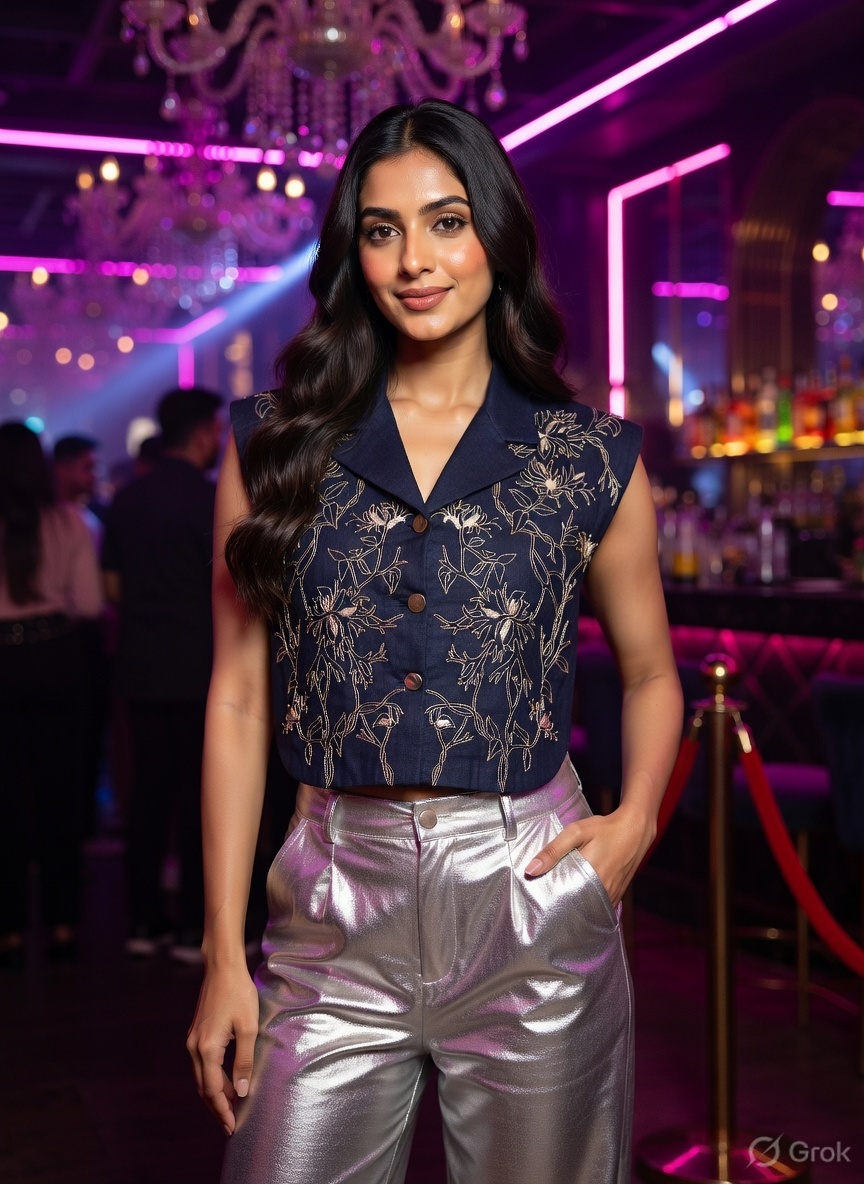 Crafted in thick silk, this crop shirt is detailed with golden outline embroidery and floral Pitta work.