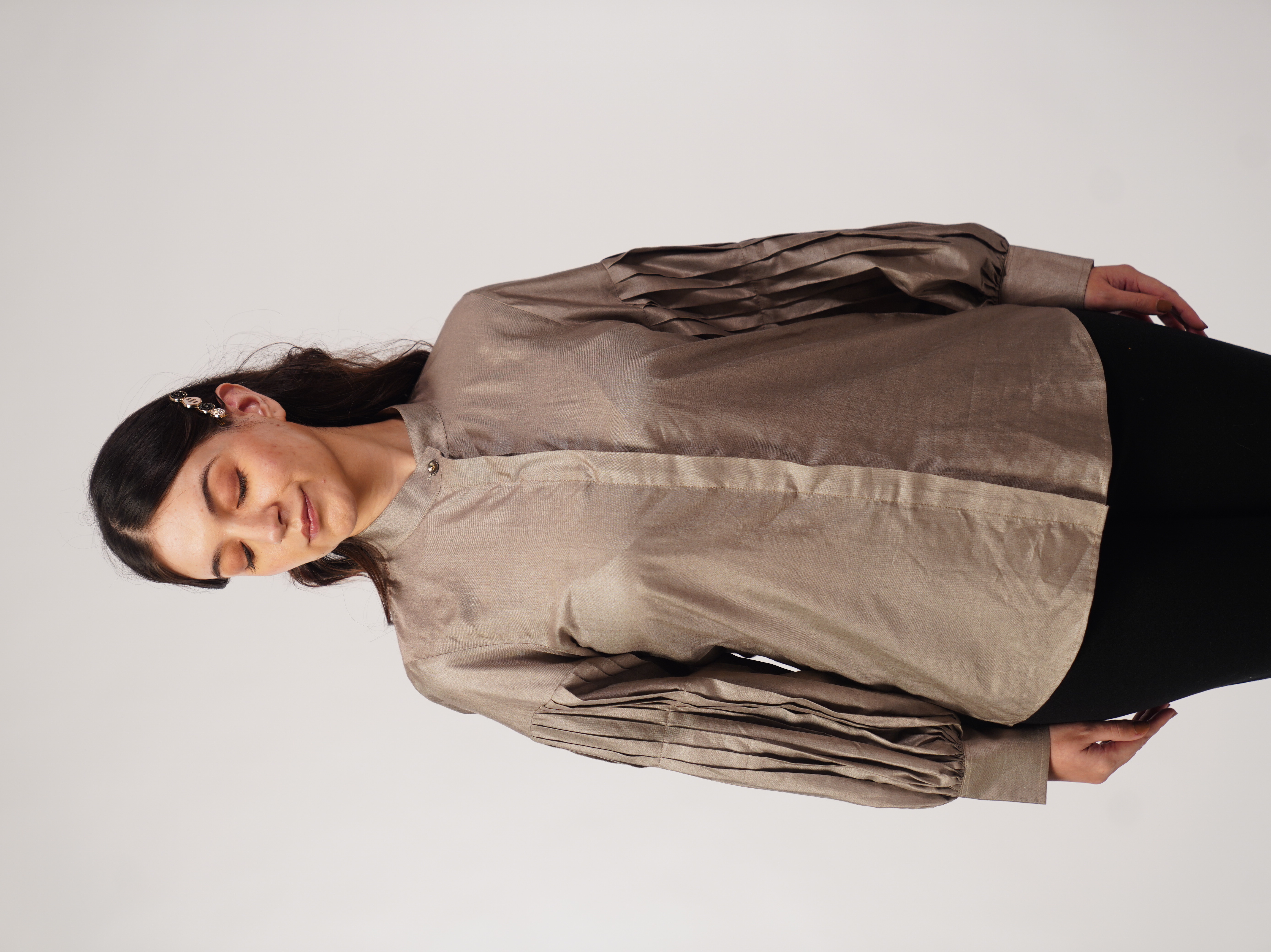 Silk shirt with pleated sleeves and a concealed placket for a sleek finish.