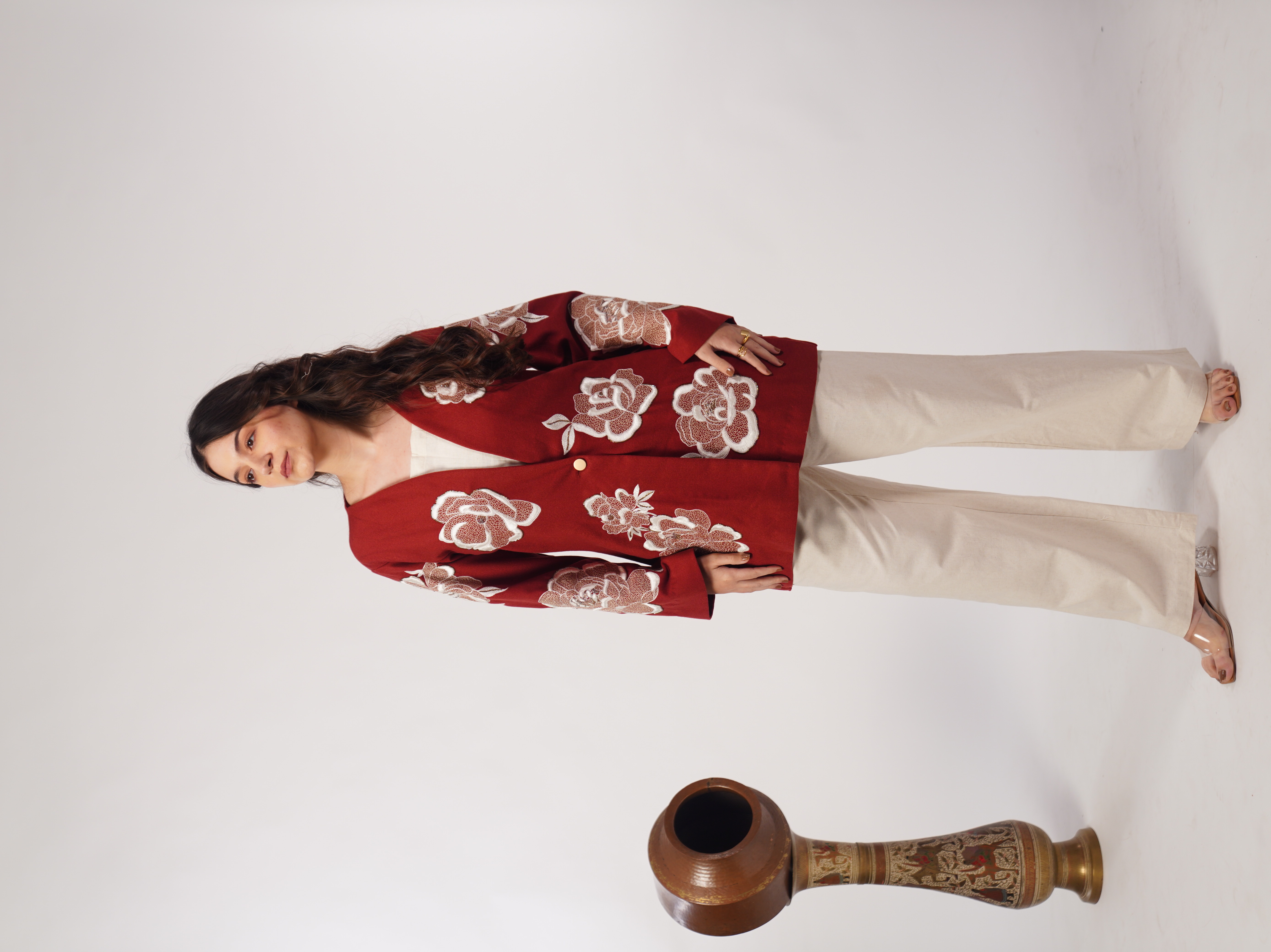 A silk off-white overcoat with cutdana and resham floral embroidery, detailed with floral motifs on the front, back, and sleeves.